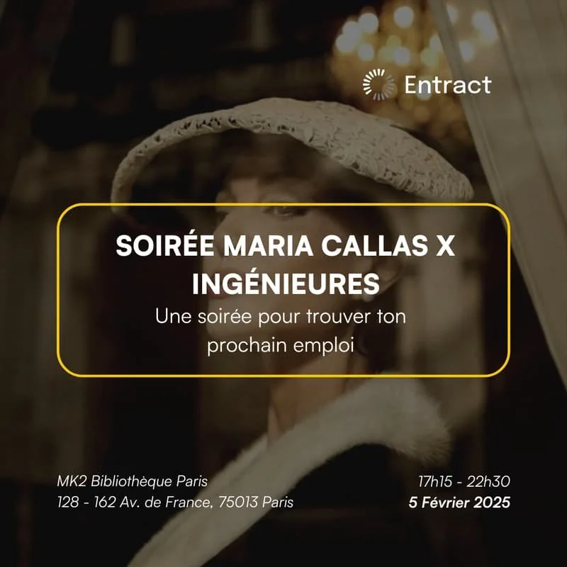 Une soirée dédiée au recrutement de femmes ingénieures en recherche de CDI, avec projection cinéma du film Maria Callas, cocktail, speednetworking, stands entreprises et offres exclusives.