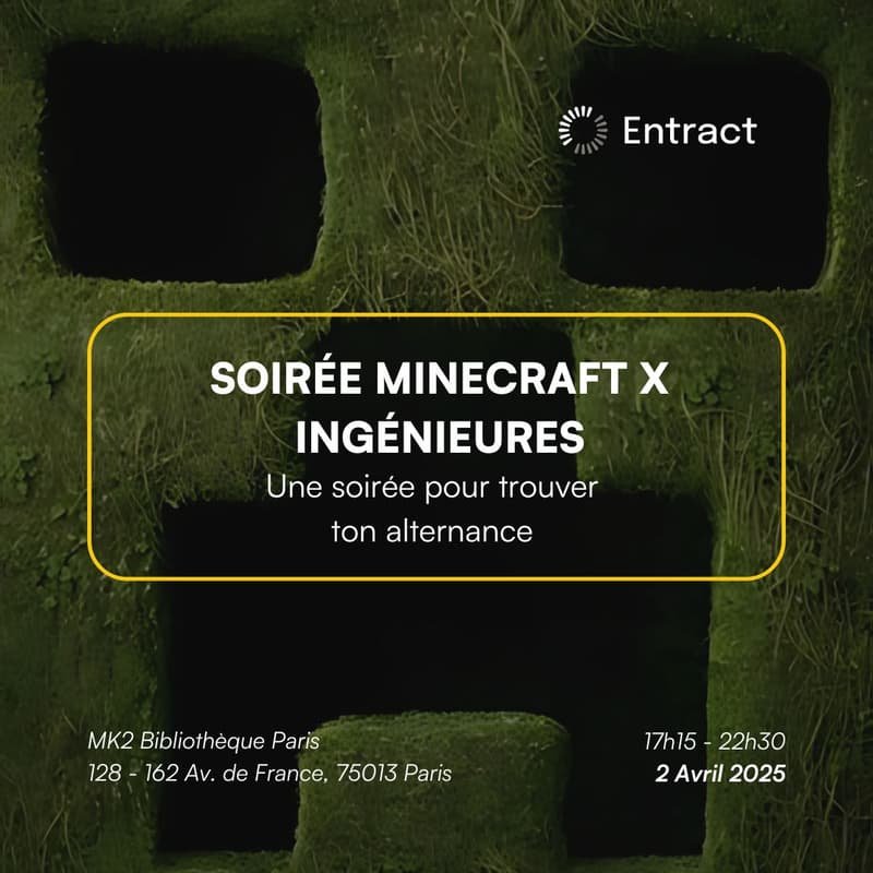 Une soirée dédiée au recrutement de femmes ingénieures en recherche d’alternance et de CDI, avec projection cinéma du film Minecraft, cocktail, speednetworking, stands entreprises et offres exclusives.